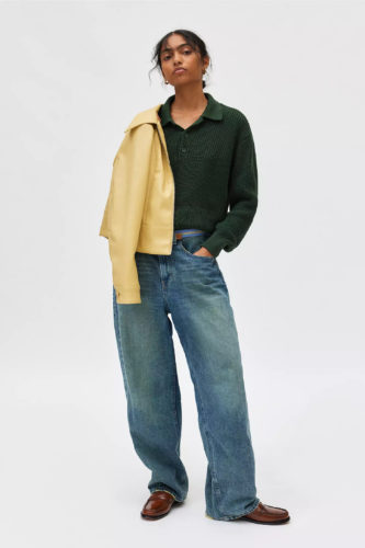 But rather than style it with a mini skirt and knee-high boots (though this looks super cute, as well), go the grandpacore route and pair it with some loose-fitting pants or trousers and some chunky loafers. Baggy, dark-wash denim would work, as well.