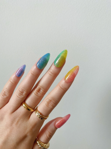 These gorgeous jelly nails are sheer with glitter embedded in each nail. I love how the rainbow fades across the hand, as opposed to just painting each nail a different shade. So beautiful and unique!